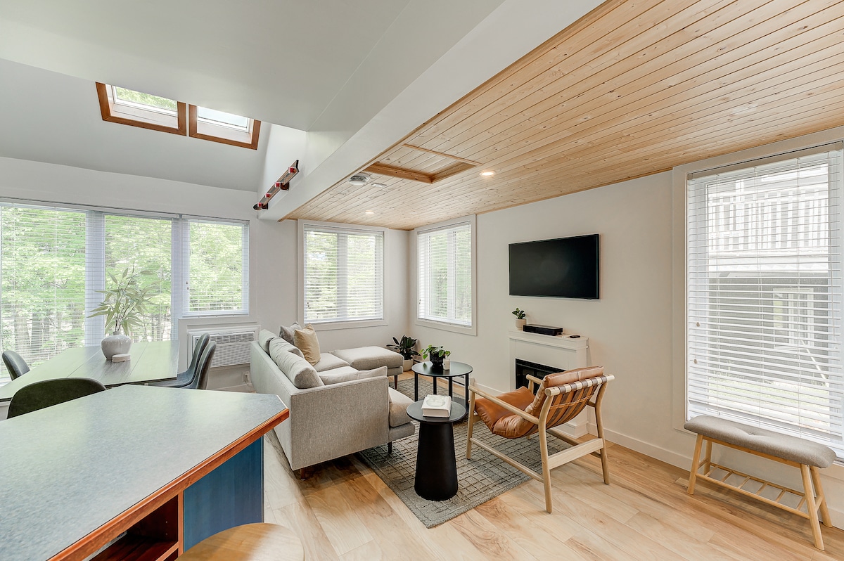 ★ Un dels xalets més singulars de Mont-Tremblant ★ Skÿe Tremblant és un allotjament privat i de luxe amb cabana de vidre i espai termal situat a la vessant de la muntanya de Tremblant. La cabina és un espai arquitectònic majestuosament vidriat que combina la simplicitat natural i el luxe contemporani, a 10 minuts del poble de Mont-Tremblant i Ski Mont-Tremblant. Al final del penya-segat, a les copes dels arbres, amb un espai habitable totalment envidrat, gaudeix de la terrassa panoràmica i de la banyera d'hidromassatge per relaxar-te. Domini compartit de 485 hectàrees. Dissenyadora canadenca.