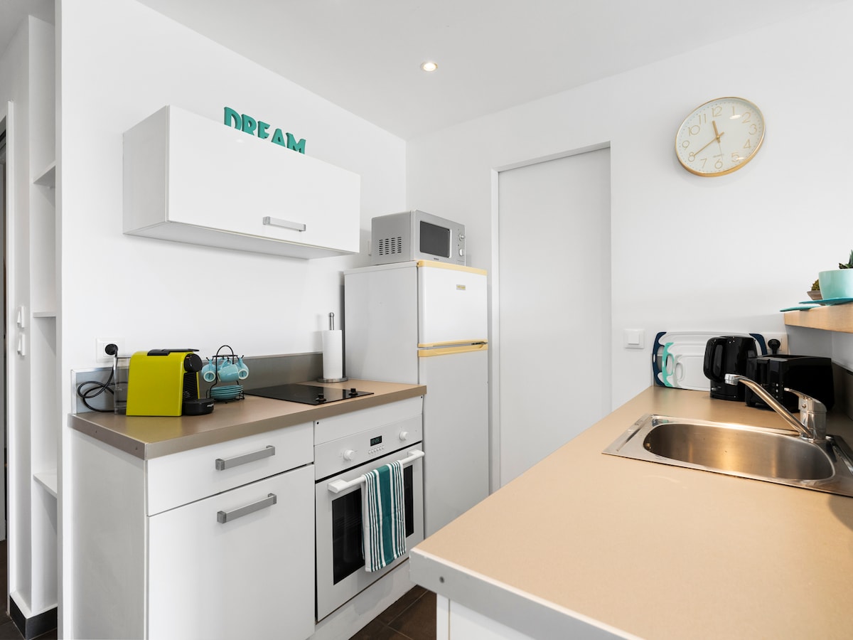 Obre la porta i gaudeix de la vista al mar! Reserva la teva escapada tropical a la bonica platja de la badia Oriental en una residència segura amb piscina. El nostre estudi acollidor, lluminós i acuradament decorat té capacitat per a 4 persones i et promet una estada inoblidable. Trobaràs: • Un llit «king size» • Un sofà llit de qualitat • Una cuina totalment equipada • Una terrassa amb vistes al mar i piscina • Un bany • Wifi • Aire condicionat • Tovalloles: de bany i de platja • Roba de llit