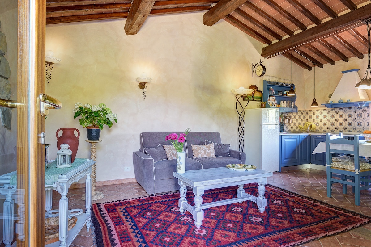 La casa gaudeix d'una rara i encisadora vista de la Val d'Orciai Monte Amiata, que garanteix la màxima privacitat. Els interiors reflecteixen l'encant de l'estil toscà, amb mobiliari antic i acabats fets per artesans locals. Està equipat amb un dormitori doble, una gran sala d'estar amb una gran taula, una cuina americana totalment equipada, un sofà llit doble davant de la llar de foc, a la sala d'estar. A l'exterior, el pati et permetrà menjar amb els colors de la posta de sol com a teló de fons.