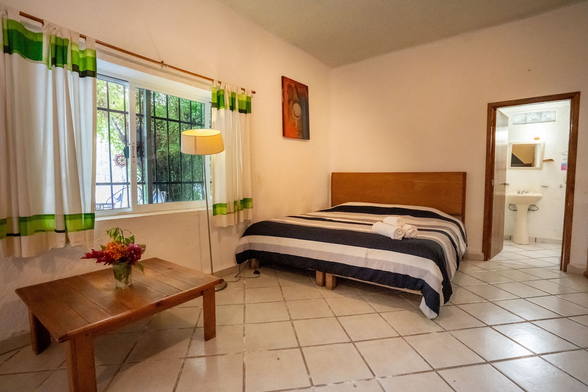 Céntrica habitación privada con magnífica vista a la montaña a unos minutos caminando del centro de Tepoztlán. Perfecta para 1 o 2 personas. Incluye una terraza común, jardín grande, baño privado, estacionamiento y asistencia hasta las 9 pm. Habitación doble.
