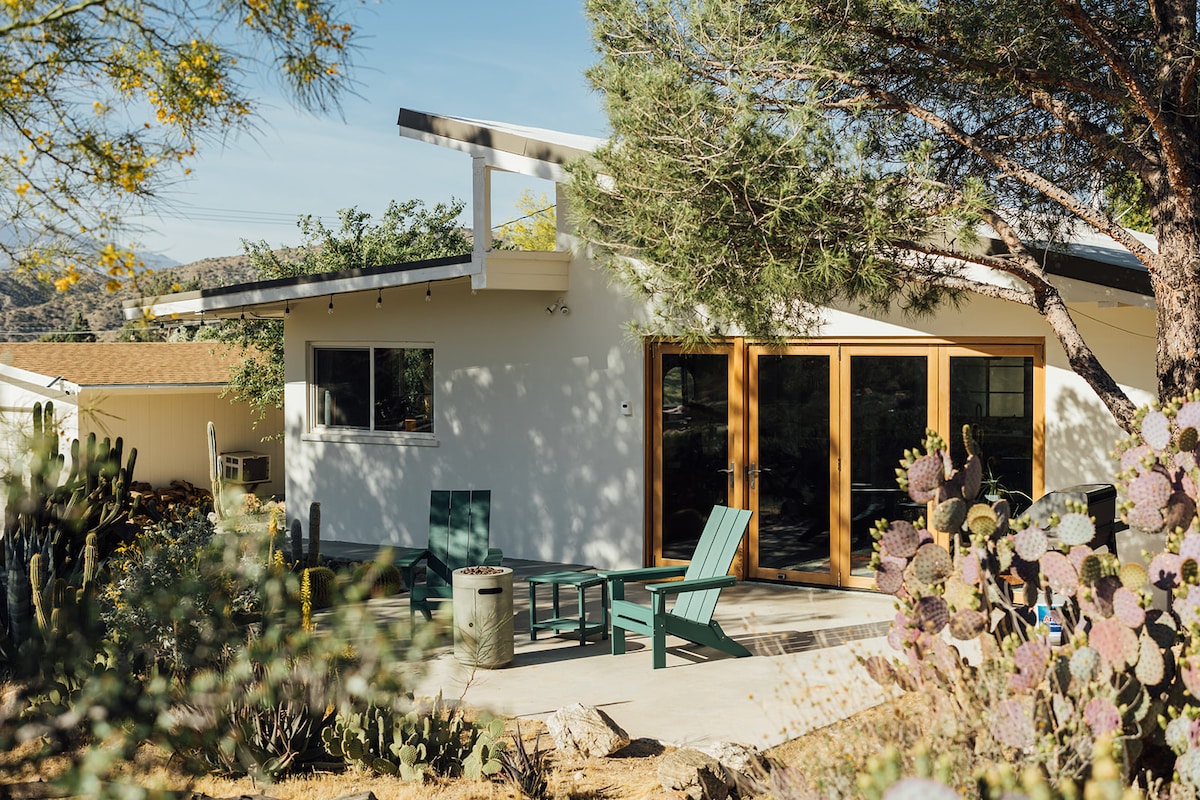 Welcome to Mockingbird Villa—a midcentury oasis located between Palm Springs and Joshua Tree. Located just a stone’s throw from Big Morongo Canyon Preserve, this dreamy hideaway offers a front row seat to 200+ species of migrating birds plus rabbits, squirrels and butterflies. Nestled on the hillside surrounded by a garden of cacti and succulents, guests can escape the cold, bustling city to enjoy morning sunrises sipping coffee on the patio and crisp evenings stargazing in the hot tub.