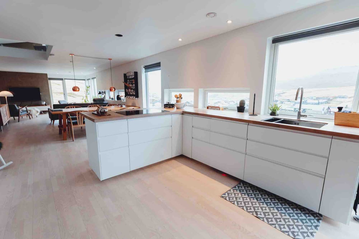 Gaudeix d'una experiència amb estil en aquest allotjament cèntric. L'apartament és completament nou i està molt ben situat a les illes Fèroe, a només mitja hora en cotxe de totes les illes. Hi ha 3 dormitoris amb llits de matrimoni i un ampli bany. Cuina-sala d'estar. Equipament de cuina complet, nevera-congelador i rentavaixelles. Sala d'estar amb un sofà gran i còmode i televisor intel·ligent amb accés a Netflix i Chromecast. Wi-Fi gratuït. Hi ha una pizzeria amb molt bona pizza a la cantonada, a poca distància. Sentir-se com a casa mentre estàs lluny de casa.