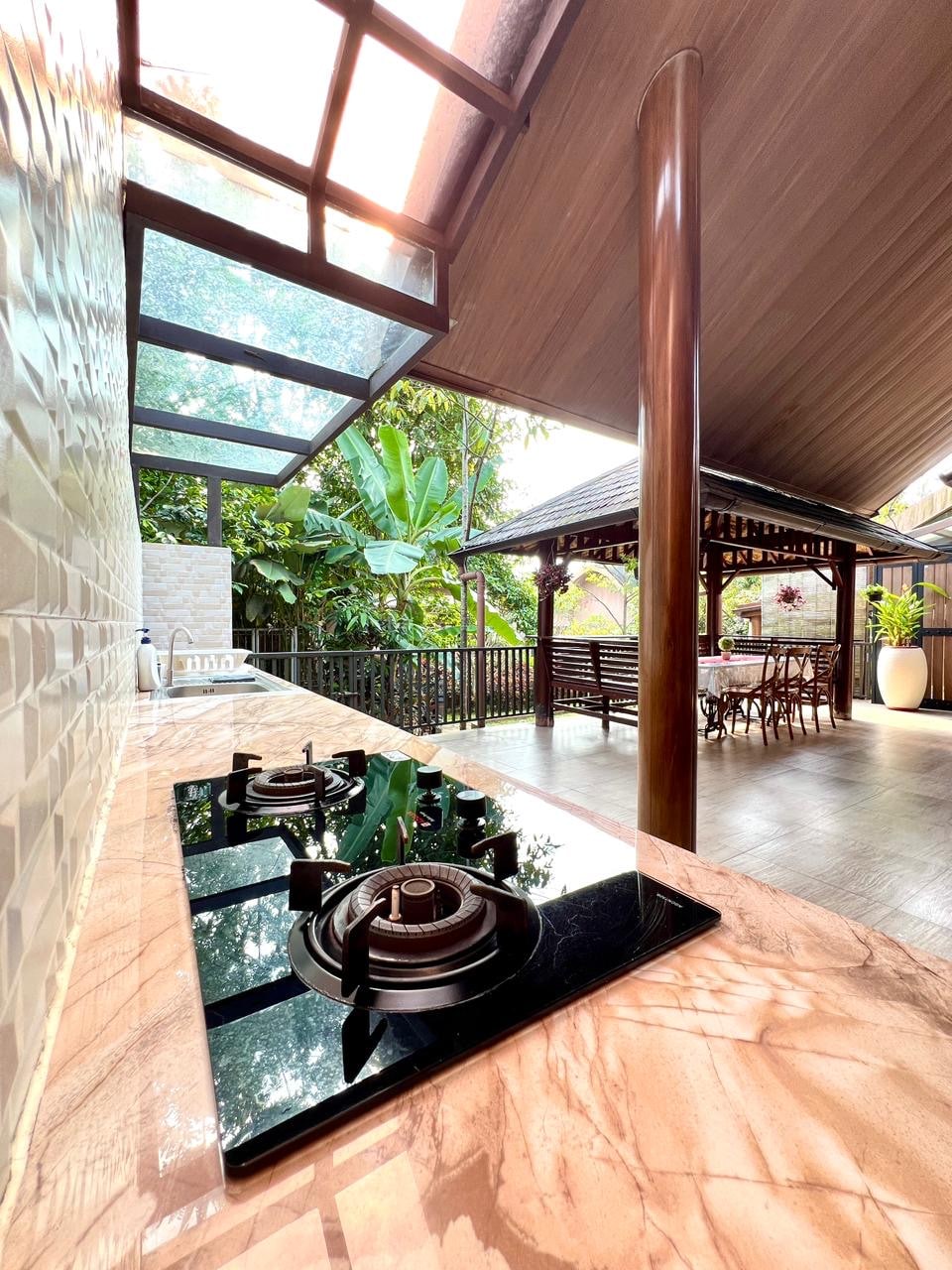 Aquesta moderna vil·la amb piscina inspirada a Bali disposa d'una gran cuina ben equipada i d'un ampli saló amb vista a la piscina i a la zona del jardí, que té una preciosa vista de la muntanya a primera hora del matí. Gaudeix d'un cafè relaxant a primera hora del matí al costat de la piscina o fes una passejada matinal per la muntanya i respira l'aire fresc de la muntanya i gaudeix de la preciosa vista de la vall.