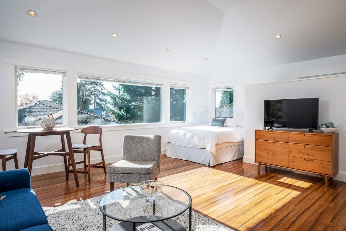 Gaudeix de l'estrany i meravellós SE Portland des d'una casa serena i de nova construcció en un barri transitable amb llit «king size» i molta llum. Desperta't ben descansat i obre la cortina del terra al sostre a la llum del matí. Gaudeix de la cuina completa i la banyera en un impressionant allotjament dissenyat per un arquitecte perfecte per als amants de la gastronomia, les parelles i el treball a distància. Excel·lent ubicació a pocs passos de fleques, botigues, parcs i taprooms. Descobreix el caràcter peculiar i els plats de moda de Belmont-Hawthorne-Tabor!