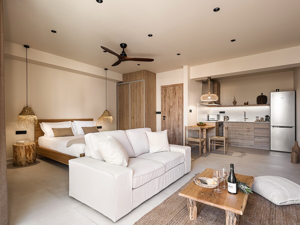 Les CASES boutique de Kores són un allotjament independent i independent de dues residències moblades que s'han desenvolupat especialment en un edifici medieval de diverses plantes completament renovat, al districte tradicional de Topanas, a la part oest del port venecià de Chania. Les dues residències són cases encantadores amb habitacions hospitalàries en línies lleugeres i frugals. L'harmonia dels espais en els nivells, els arcs, les parets eròtiques, les galeries i les parets venecianes que constitueixen una part de la casa, creen un sorprenent conjunt d'arquitectura medieval a les dues residències amb els noms "Aspasia" i "Ekaterini". "Aspasia" ocupa la planta baixa i la primera planta de l'allotjament i consta de: La planta baixa amb un dormitori doble i un altre amb sofà: llit i un bany amb dutxa oberta. La primera planta amb la sala d'estar, el menjador i la cuina de planta oberta, dos banys amb dutxes tancades, un dormitori principal a l'loft i un dormitori amb dos llits individuals a sota. "Ekaterini" ocupa la segona i tercera planta de l'allotjament i consta de: La segona planta amb la sala d'estar, el menjador i la cuina oberta, un dormitori amb dos llits individuals, una sala amb el sofà "turc" que pot allotjar fàcilment una cinquena persona a la residència si cal i un bany amb dutxa tancada. Les habitacions de la segona planta tenen accés a un jardí amb una taula de menjador, sis cadires i un para-sol que ofereix una àmplia ombra. La tercera planta amb un dormitori principal i la seva terrassa privada amb un sofà, una taula de pati i tauletes de sol donen l'oportunitat als hostes de relaxar-se sota el sol i de les vistes sense obstacles de les tradicionals carreres, els terrats i els lofts d'edificis i de les muntanyes del sud.
