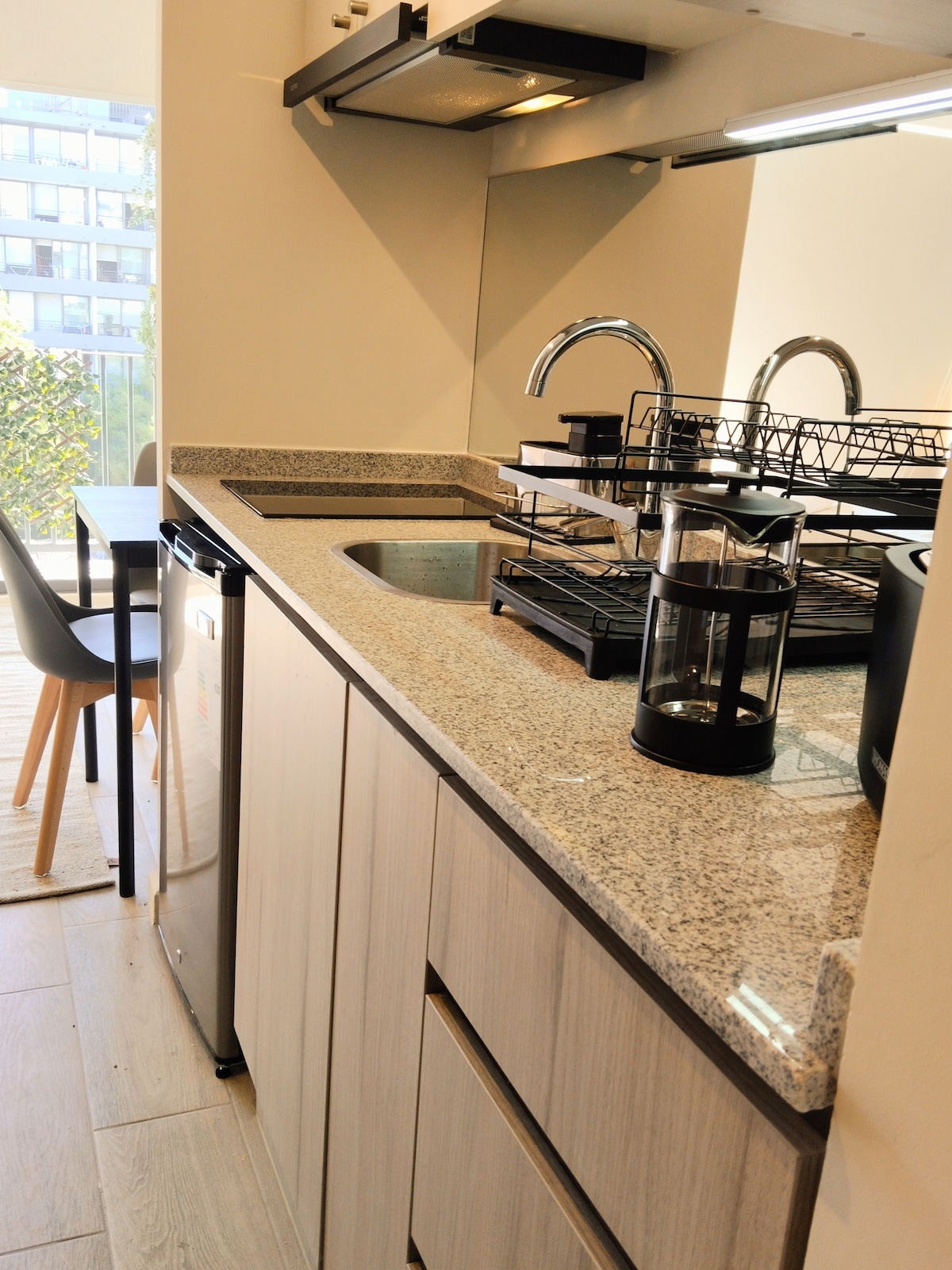 Gaudeix d’aquest estudi amb accés a Internet a prop de Movistar, al cor de la ciutat. Espai funcional amb: dormitori, bany (tovalloles de cos, sense articles de dutxa), cuina totalment equipada/espai de treball/Wi-Fi, televisor intel·ligent. A poca distància a peu del metro, del parc d’Almagro, del passeig de Bulnes, d’un supermercat, de la Universitat Central, de botigues, del teatre Caupolicán i d’hospitals. A prop de l'estadi Movistar Arena (a 7 minuts en cotxe, a 35 minuts a peu) Registra les teves dades a la consergeria i accedeix a l'allotjament les 24 hores amb el codi d'accés electrònic.