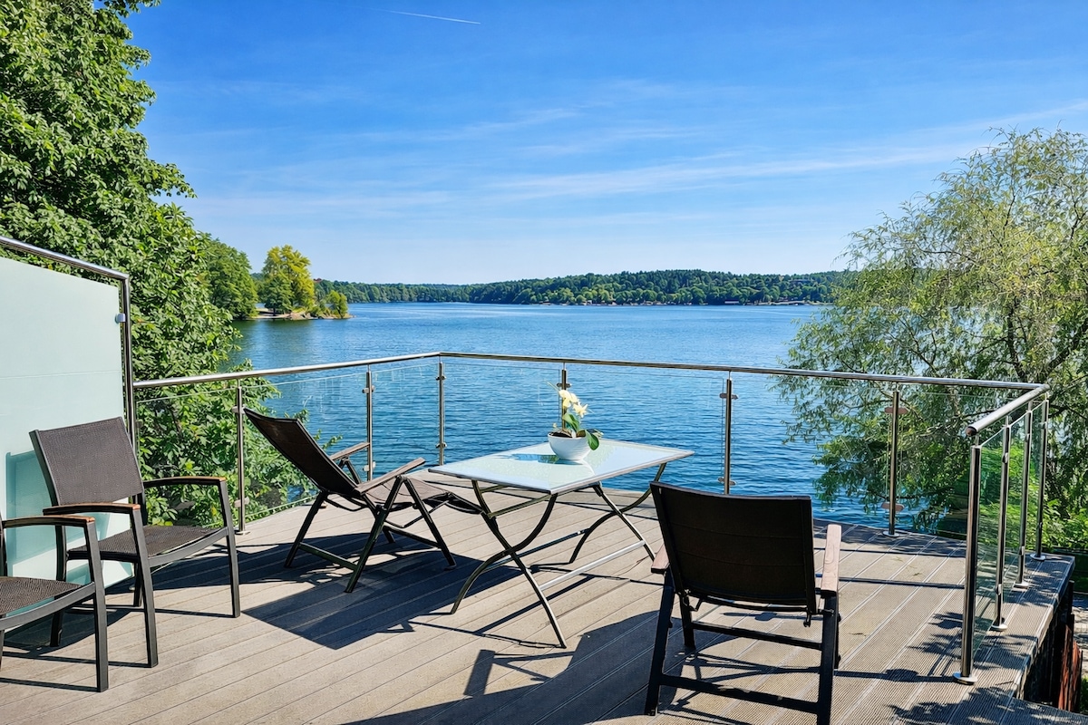 Mieszkanie w pięknej lokalizacji nad jeziorem, oferujące dostęp do prywatnego pomostu, idealne na relaksujące chwile nad wodą. W ogrodzie znajduje się palenisko oraz strefa do spożywania posiłków na świeżym powietrzu. Zaledwie 15 minut spacerem do centrum miasta. Spokojna i cicha okolica zapewnia komfortowy wypoczynek, a bliskość lasu umożliwia codzienne spacery wśród natury. Inspirująca przestrzeń z widokiem na zieleń i jezioro sprawia, że mieszkanie jest idealnym miejscem do odpoczynku.