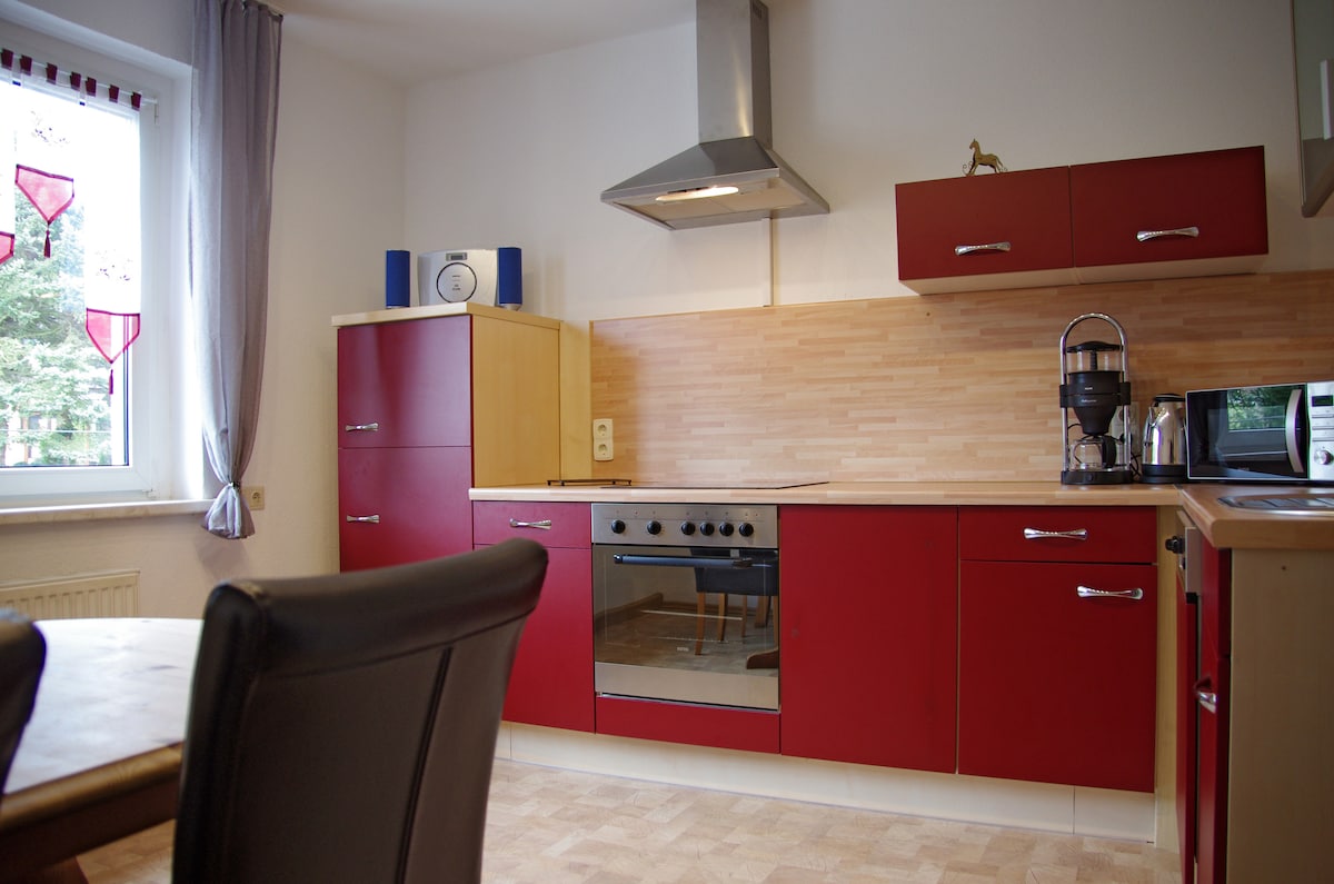 Sonnige Ferienwohnung am Stadtrand von Zwickau. Gute Anbindung an B 93, B 173, A 72 und A 4. Zur Wohnung gehören eine große Küche, komplett ausgestattet mit Herd, Kühlschrank, Geschirrspüler, Mikrowelle, Kaffeemaschine, Toaster, Wasserkocher und viel Geschirr. Das gemütliche Wohnzimmer ist mit TV, Schlafsofa und Sessel ausgestattet. Im Schlafzimmer gibt es 3 Einzelbetten, Kommoden und Kleiderschrank.