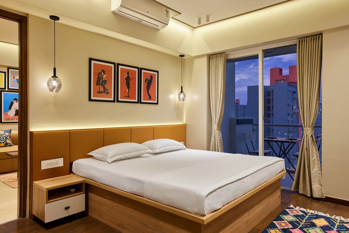 Entra en un món de serenitat mentre obres la porta per "Respira".« Aquest apartament de luxe d'un dormitori ben dissenyat en una propietat de golf de 40 hectàrees és un santuari enmig de la bulliciosa vida de la ciutat, que t'ofereix un refugi tranquil per relaxar-te, relaxar-te i recarregar forces. Situat a prop de Bombai, l'autopista Pune, fa que aquesta propietat sigui perfecta per a una visita ràpida a la ciutat de Pune o simplement per fer una escapada de cap de setmana. L'apartament ofereix vistes panoràmiques del camp de golf, el riu i la serralada.