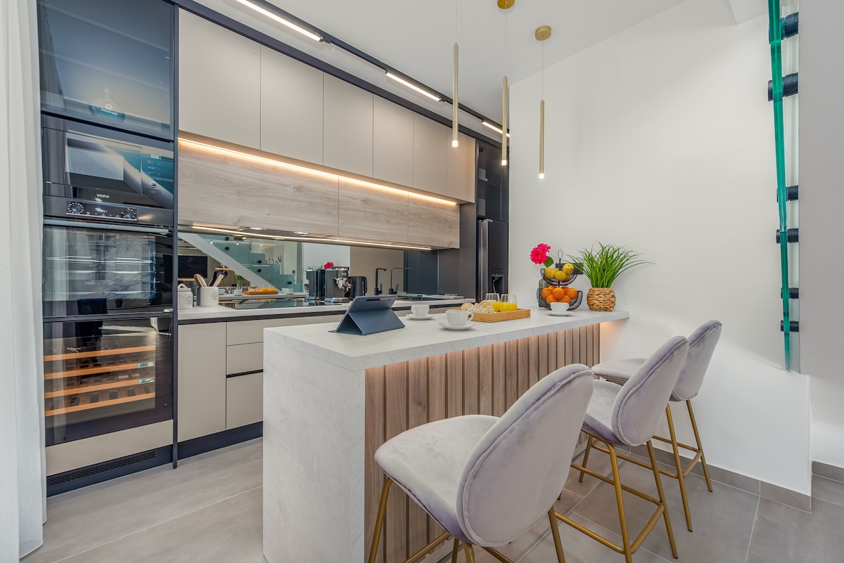 L'allotjament de vacances es troba a la planta baixa, que està connectada amb el jardí i la piscina. L'espaiosa zona té dos dormitoris que tenen els seus propis banys. Cada habitació té aire condicionat i televisor propi. També hi ha una taula de maquillatge. Sala d'estar àmplia amb sofà. La cuina està modernament equipada, amb tots els electrodomèstics de la cuina. Des de nevera, congelador, forn, microones, torradora, bullidor, cafetera, rentaplats, hi ha un ampli menjador amb taula de menjador.