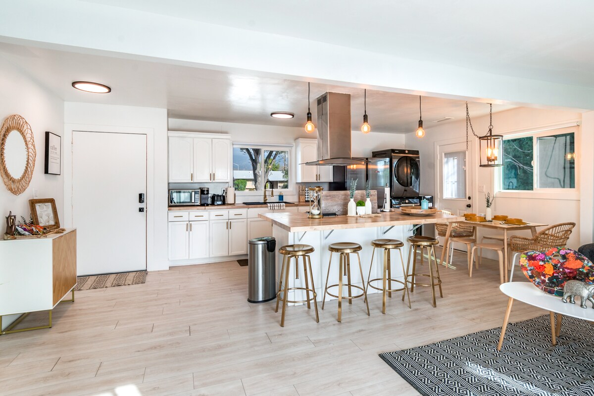 Aquesta tranquil·la i lluminosa caseta situada al bosc nacional de San Bernardino està envoltada de pins, aire fresc de muntanya i unes vistes magnífiques. Arrauleix-te a la vora de la llar de foc amb un bon llibre o escolta discos de la col·lecció de vinils. La gran coberta posterior té la millor vista on pots gaudir de begudes, àpats o asseure't al costat de la llar de foc de gas. Botigues de segona mà, botigues familiars, passejades pel llac Gregory, tot és aquí per al teu gaudi.