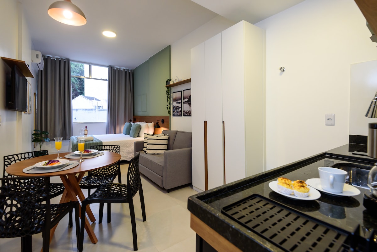 Loft romàntic entre Santa Teresa i Laranjeiras amb vistes panoràmiques de la badia de Guanabara, el Morro do Pão de Açúcar i el Crist Redemptor. Dissenyat per nosaltres, arquitectes i dissenyadors, combina mobles fets a mà, obres d'art i fusta reciclada. Perfecte per a parelles, sessions de fotos o celebracions especials, amb encant, privacitat i accés fàcil a les principals atraccions de Rio.