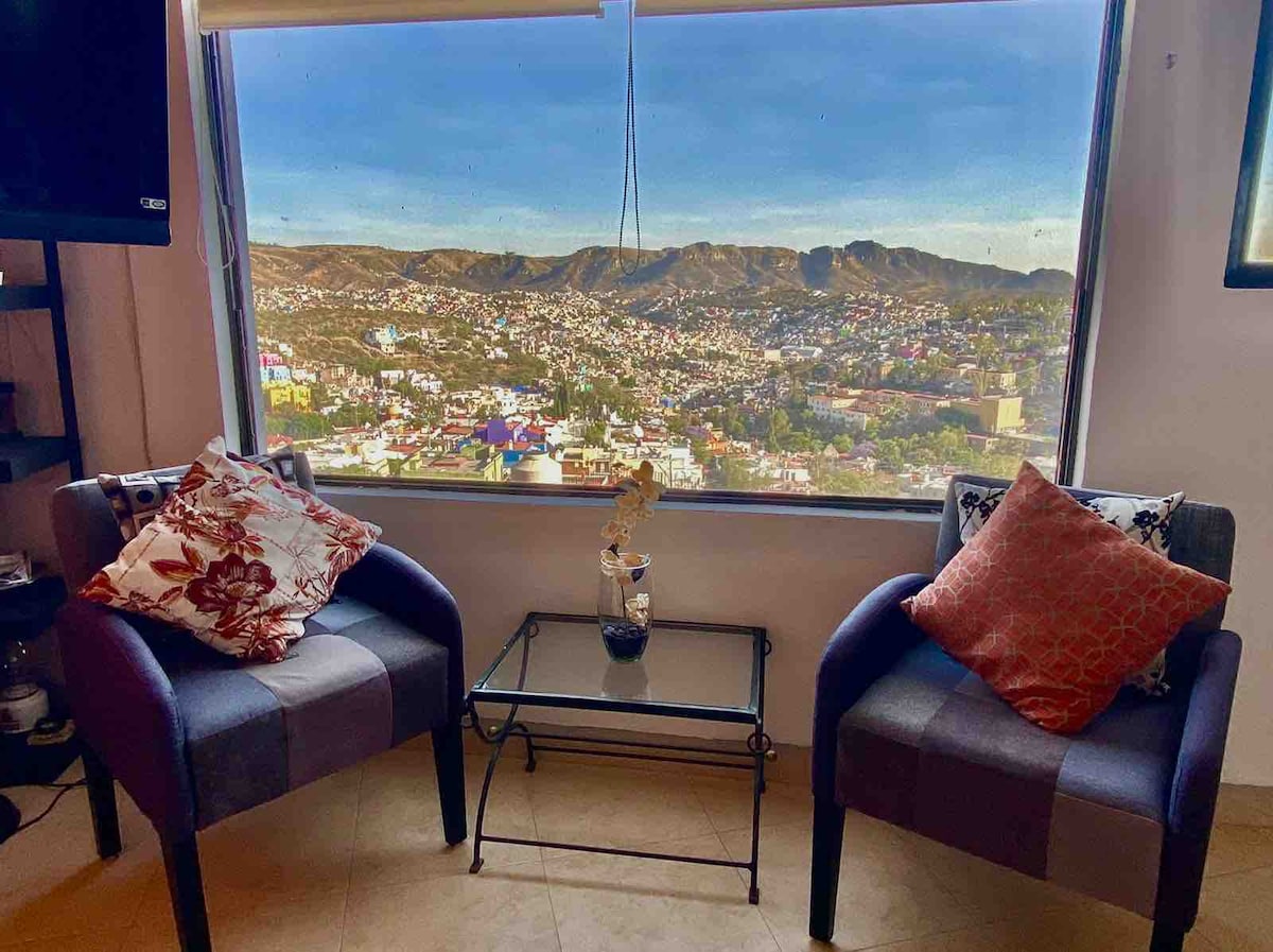 Perfectly located in the center of Guanajuato on historic and colorful Tecolote, a tranquil PEDESTRIAN street only a few minutes walk uphill from plentiful restaurants, bars, theaters and activities. This apartment offers incredible VIEWS, beautiful old world charm and modern conveniences. The balcony is right off a comfortable living/dining/kitchen area, a great space to hang out and relax. The separate bedroom has 2 closets and a bed comfortable enough to ensure you a fabulous nights rest.