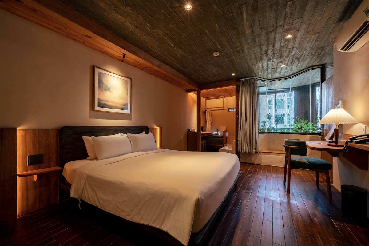This cozy room at The Memory Danang features warm wooden interiors combined with a minimalist concrete ceiling, creating a calm and private atmosphere, perfect for couple. The room features a window with natural light, next to it is a minimalist wooden desk with a warm lamp and a comfortable chair — perfect for working remotely or enjoying a quiet moment in your private space. A highlight of the room is the terrazzo bathtub, thoughtfully designed for a relaxing bathing experience.