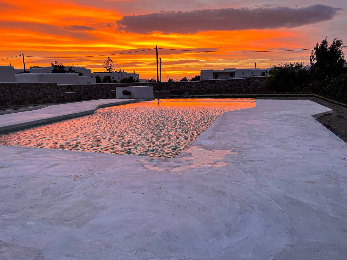 * LA PISCINA ÉS PRIVADA* Aquest nou apartament amb 2 dormitoris i 2 banys es troba molt cèntricament a Ornos, a només 500 metres de la platja d'Ornos i a 200 metres de la platja de Korfos. Compta amb una gran piscina privada i és perfecte per a famílies o grups d'amics. Situat a només cinc minuts de supermercats, restaurants i botigues, té una vista impressionant sobre el mar Egeu. També a 2 minuts (a peu) hi ha una parada d'autobús que et pot portar a la ciutat de Mykonos. També oferim neteja diària gratuïta i aparcament.