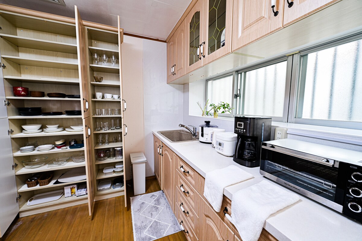 Recomanat per a viatges en família o en grup♪ El bonic passeig marítim al llarg de la platja també està a 1 minut a peu. Pots gaudir d'un passeig mentre veus la preciosa posta de sol. Hi ha moltes cafeteries i restaurants elegants pels voltants, i un supermercat i una farmàcia al barri per a les estades en família. Es troba a 5 minuts en cotxe del popular lloc turístic "Chatan American Village" i a 1 minut a peu del passeig marítim de la costa de Miyagi. Oferim cotxes de lloguer assequibles per a 7 passatgers. (Cal fer reserva)