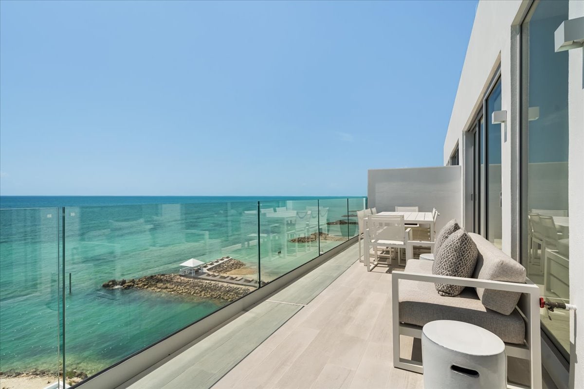 Et donem la benvinguda a la suite Sky Beach. Una joia amagada dins de la col·lecció Calypso House de vil·les privades amb vistes al mar. La seva alçada ofereix vistes sense obstruccions de l'oceà sud-est a només uns passos de la propietat que condueixen tant al famós port esportiu de Palm Cay, el llegendari Bluewater cay com les Exumas. Aquest estudi inspirat en una petita casa disposa d'un llit «queen size» elevat amb vista completa a l'oceà, un petit dormitori independent amb un llit individual sobre un de doble i una banyera relaxant.