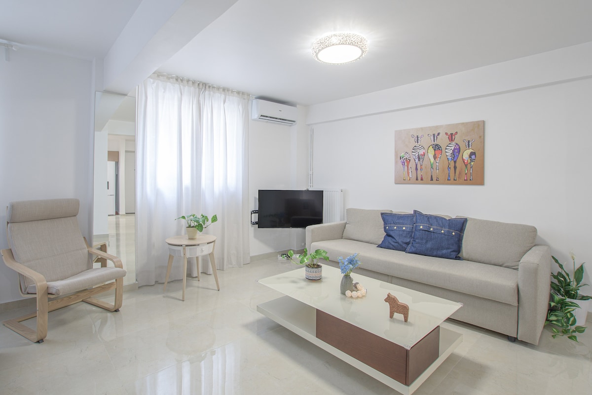 Estudi lluminós i relaxant, a la 6a planta, totalment renovat el 2022 amb una gran terrassa privada, en un barri segur i bonic, a 5 minuts de la plaça Nea Smyrni a peu. Hi ha molts cafès, bars, restaurants i suvlaki. Hi ha un tramvia (Megalou Alexandrou) i una estació d'autobusos (a Syggrou) a uns 5 minuts a peu que et poden portar a la platja o al centre d'Atenes (uns 15 minuts). També pots visitar el Nea Smyrni Grove, a menys de 10 minuts a peu.
