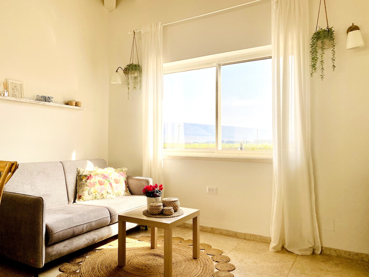 Un bonic amagatall pastoral amb vistes al mont Hermon i a poca distància del riu Jordà. Els nostres hostes poden gaudir de la tranquil·litat i l'impressionant paisatge de l'Alta Galilea, mentre gaudeixen de la comoditat dels nostres allotjaments de kibutz nous i ben equipats (construïts el 2021). La suite disposa d'un dormitori privat amb un llit doble, una àmplia sala d'estar amb un sofà llit, una dutxa, una cuina americana totalment equipada i una barbacoa exterior.