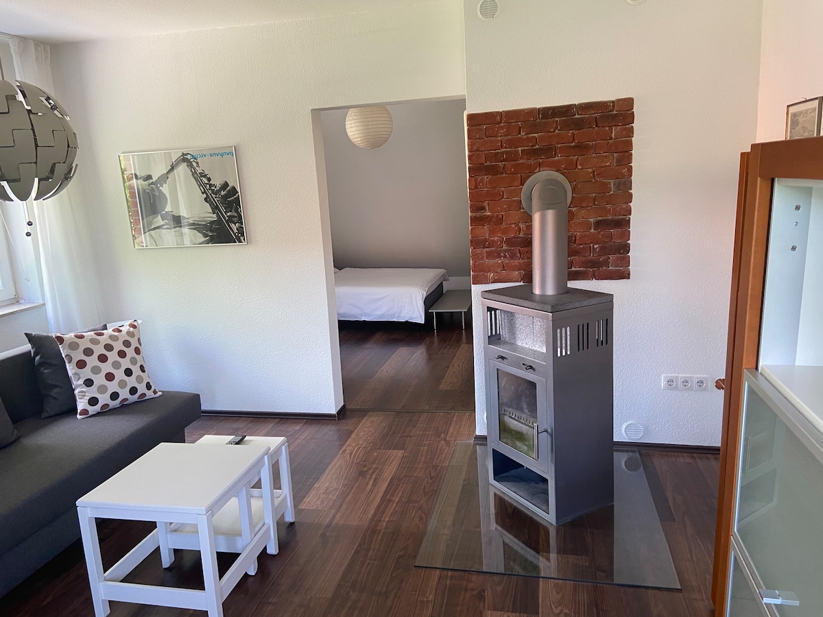 Oblida't de les preocupacions: Aquesta casa tranquil·la i independent et convida a esmorzar a la terrassa amb una àmplia vista sobre camps, boscos i molta vegetació. Perfecte per a unes vacances o un cap de setmana per a dos. Per als dies freds o les nits acollidores, hi ha una sauna separada, una banyera d'hidromassatge i una estufa de rajola per encendre amb llenya. Pots anar de compres a peu i també trobaràs molts camins de senderisme i boscos bonics.