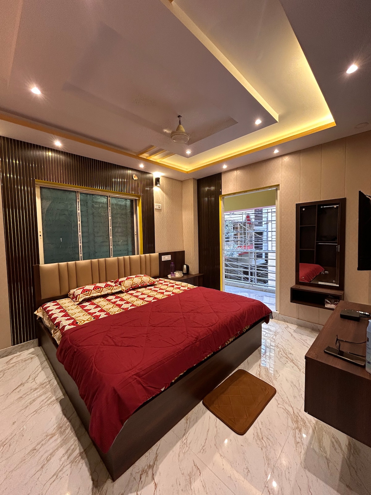 El nostre allotjament es troba al centre de Newtown, Calcuta. Aeroport internacional, autobús, metro, cinema, centres comercials, mercats, hospitals, col·legis, oficines informàtiques, atraccions turístiques, etc., tots estan a prop. T'oferim un vestíbul espaiós amb TV intel·ligent, zona de menjador, una cuina ben equipada, 2 dormitoris amb aire condicionat amb banys adjunts i balcons que consta d'1 llit king size, 1 llit queen size i un matalàs addicional que pot allotjar 6 persones amb 800 € addicionals per nit per al sisè hoste.