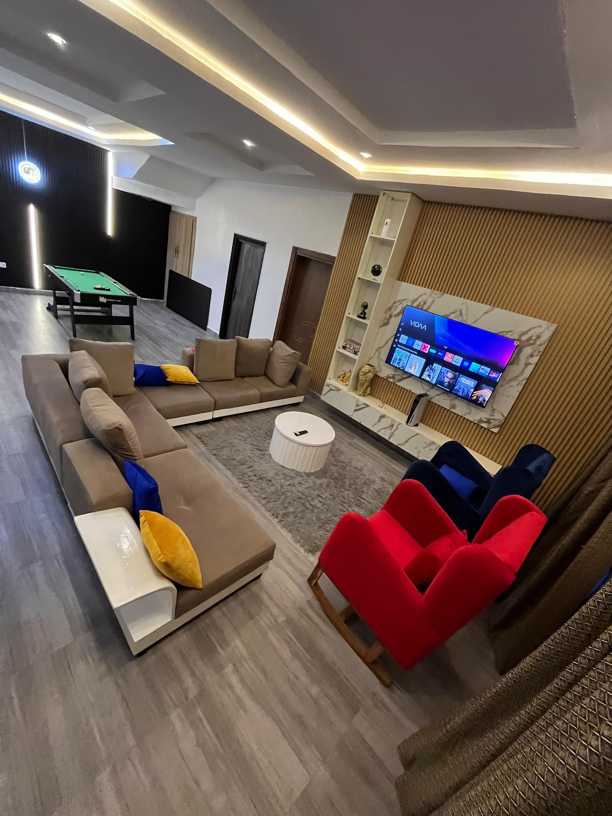 Les cases Morak són un oasi en una ciutat concorreguda, la nostra casa moderna, intel·ligent, bonica i lluminosa, la nostra casa de 4 dormitoris és perfecta per a famílies tranquil·les, parelles o amics que busquen una estada tranquil·la i entretinguda. L'interior dissenyat amb bon gust proporcionarà un entorn tranquil i còmode per a tu mentre visites Abuja. La propietat té piscina, sala de jocs, billar, futbolí de taula, PS5, Netflx, wifi ràpida, DsTv. Tots els televisors són intel·ligents