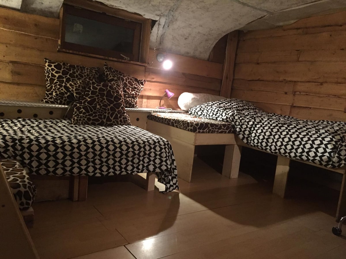 Picture yourself relaxing in the hottub watching the birds and squirrels or watching Netflix on the beamer. Or enjoy yourself in the infrared sauna after preparing your meal on the gas BBQ. The bathroom is shared, but only with the owner. Full equiped kitchen with free koffie and thee in the romantic wooden cabin, which has a big fridge with freezer, TV, electric heater and airco. Though the owner is nearby, you'll have complete privacy. Cuddling with the dog is very much appreciated by her!