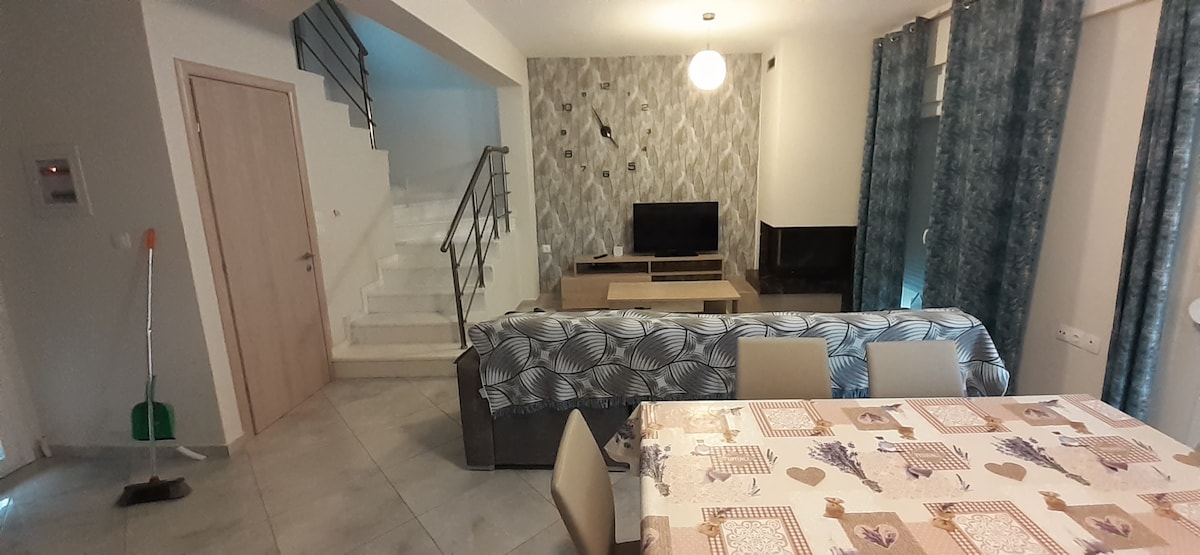 Vil·la única de 80 m², a només 60 m a peu de la platja de Nikiti, al costat del bar de platja Kukunari, la casa de platja Ergon, el bar de platja AMO i a només 1 km a peu del centre de Nikiti! Acabat de renovar el 2025 amb totes les comoditats que necessita cada família. La vil·la pot allotjar fàcilment fins a 6 adults + 2 nens. Aigua calenta les 24 hores. Connexió a internet estable de 150-200 Mbps, 2 televisors intel·ligents. Fes que les teves vacances siguin especials! Gaudeix de l'estiu! Celestial Luxury Nikiti