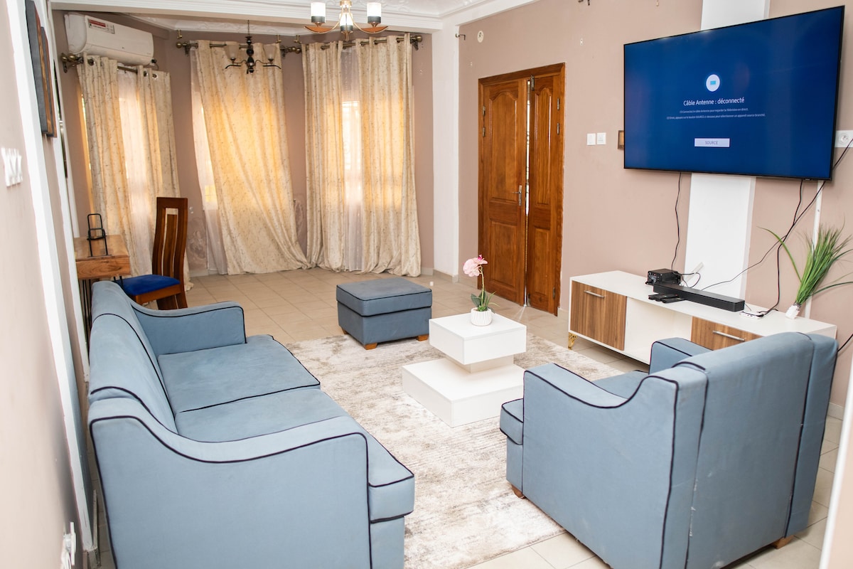 Bienvenue dans notre appartement sécurisé et facilement accessible en bordure de route à Douala. Ici, votre tranquillité est assurée grâce à un gardien présent 24h sur 24 et un système de télésurveillance. L’appartement comprend un salon et une chambre avec télé, une cuisine tout équipée, du Wi-Fi illimité et un groupe électrogène. Vous pourrez aussi profiter d’un espace extérieur pour vous détendre. C’est donc un lieu sûr, confortable et rassurant pour votre séjour.