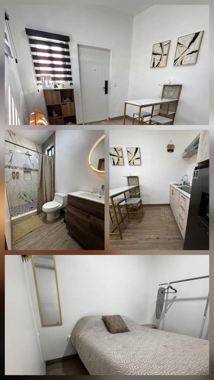 Estudio Loft al sur de Nogales Sonora, ubicado en Residencial con acceso controlado, a 3 min. del nuevo IMMS, 15 min de USA, 10 min. del Consulado & del Centro comercial. Ubicado en un segundo piso, cuenta con WIFI, cama King size, cocina equipada, televisión, refrigerador, minisplit, calefacción, abanico de techo, regadera con agua fría y caliente, baño completo, ventanas y balcón, acceso independiente, además de cerradura electrónica. Estacionamiento dentro del residencial.