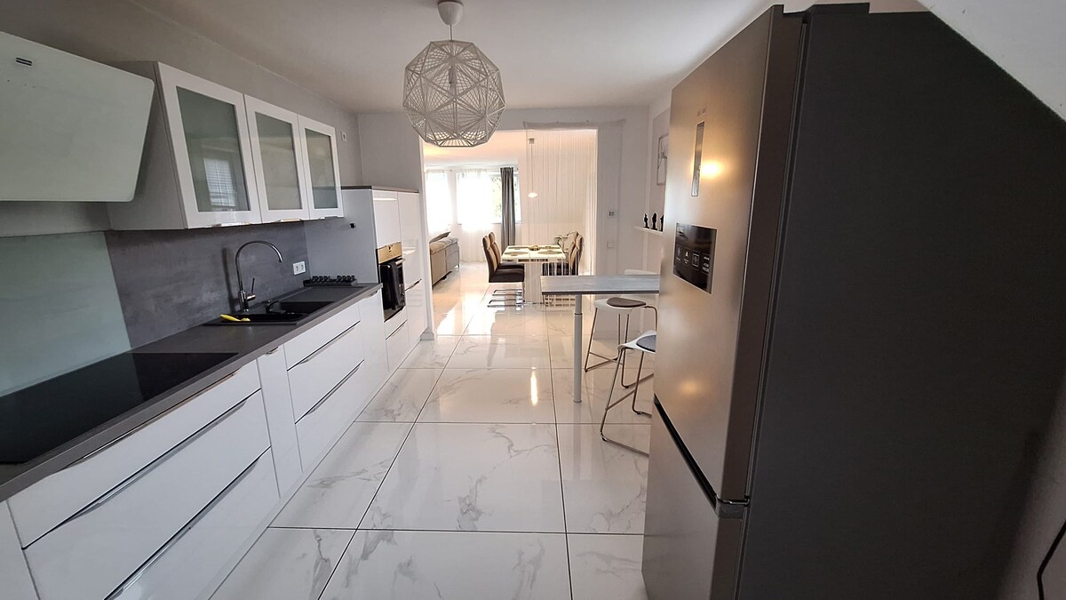 Oblida't de les preocupacions en aquest espai espaiós i tranquil. Al 2015, la casa completament modernitzada i decorada constantment amb 152 metres quadrats, fins a 8 persones més 2 nadons tenen prou espai , la casa té calefacció per terra radiant, cuina d'alta qualitat, bugaderia, rentadora, assecadora, 2 banys , 1 dutxa i 1 banyera. 3 dormitoris cadascun 1 televisor. WLan . Àmplia sala d'estar, cuina oberta, sala d'estar amb llar de foc. Un jardí preciós, plantació de pantalla densa, terrassa coberta.