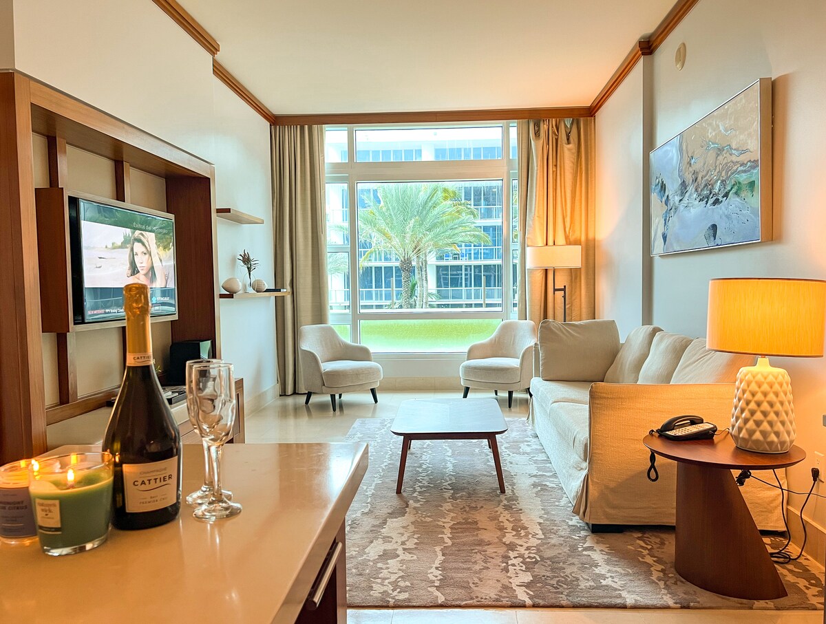 Vine, passa un cap de setmana o uns dies i experimenta l'epítome del luxe al nostre apartament d'un dormitori exquisidament renovat situat dins de The Carillon Miami Wellness Resort. Aquesta unitat disposa d'una sala d'estar independent amb un sofà llit extraïble, una cuina totalment equipada, un escriptori de treball amb un segon monitor de pantalla i un luxós bany tipus spa, tot accentuat per finestres del terra al sostre que mostren vistes panoràmiques de la impecable platja que s'estén fins a Fort Lauderdale i l'oceà turquesa.