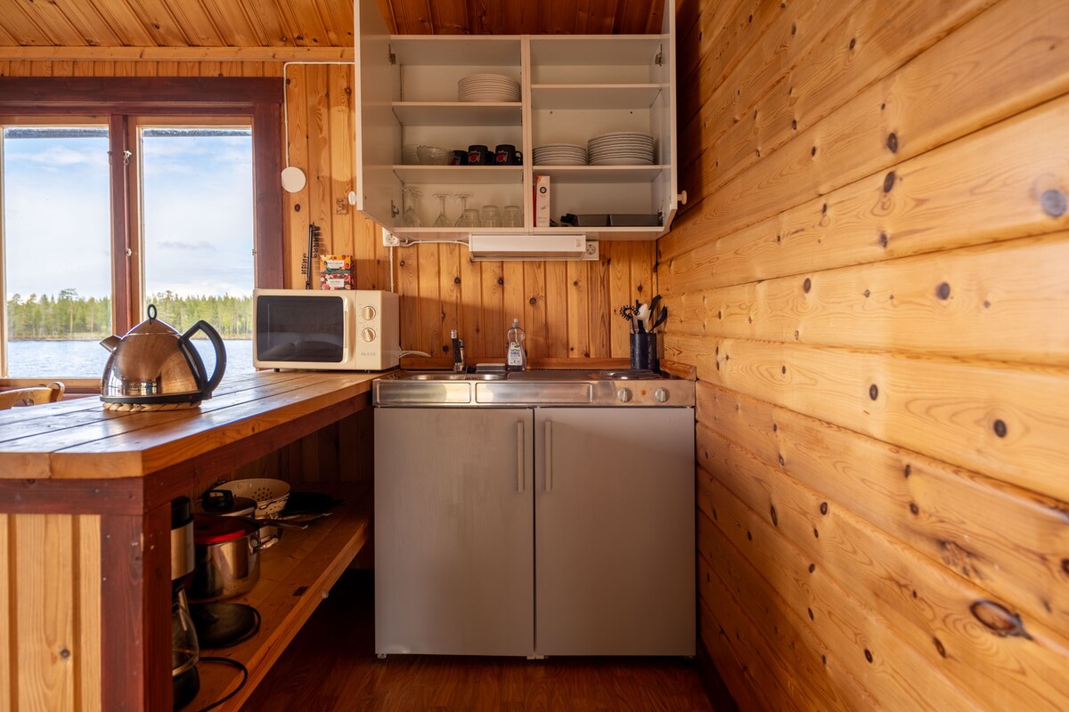 Una cabana de troncs desenvolupada amb amor amb estufa de llenya, cuina, llits dobles i individuals en una ubicació tranquil·la a la vora d'un bressol. Aquí tens comoditat i aventura sota un mateix sostre i, per descomptat, l'oportunitat de veure les aurores boreals directament des del dormitori. Una cuina totalment equipada, un menjador i una acollidora sala d'estar davant del forn completen l'oferta a la cabana de troncs. També la caseta té electricitat.