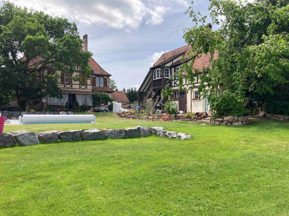 Hola, et donem la benvinguda amb els nostres animals a la nostra casa situada en un petit poble alsacià a la ruta del vi. Tindràs un espai privat de 40 m² a la planta superior, que comprèn 1 dormitori, 1 bany gran amb dutxa i vàter, així com una petita sala d'estar amb taula i cadires (zona de relaxació o per prendre els àpats) a l'entresol obert sobre els nostres espais privats. El microones, els plats i l'bullidor estan a la teva disposició al entresòl