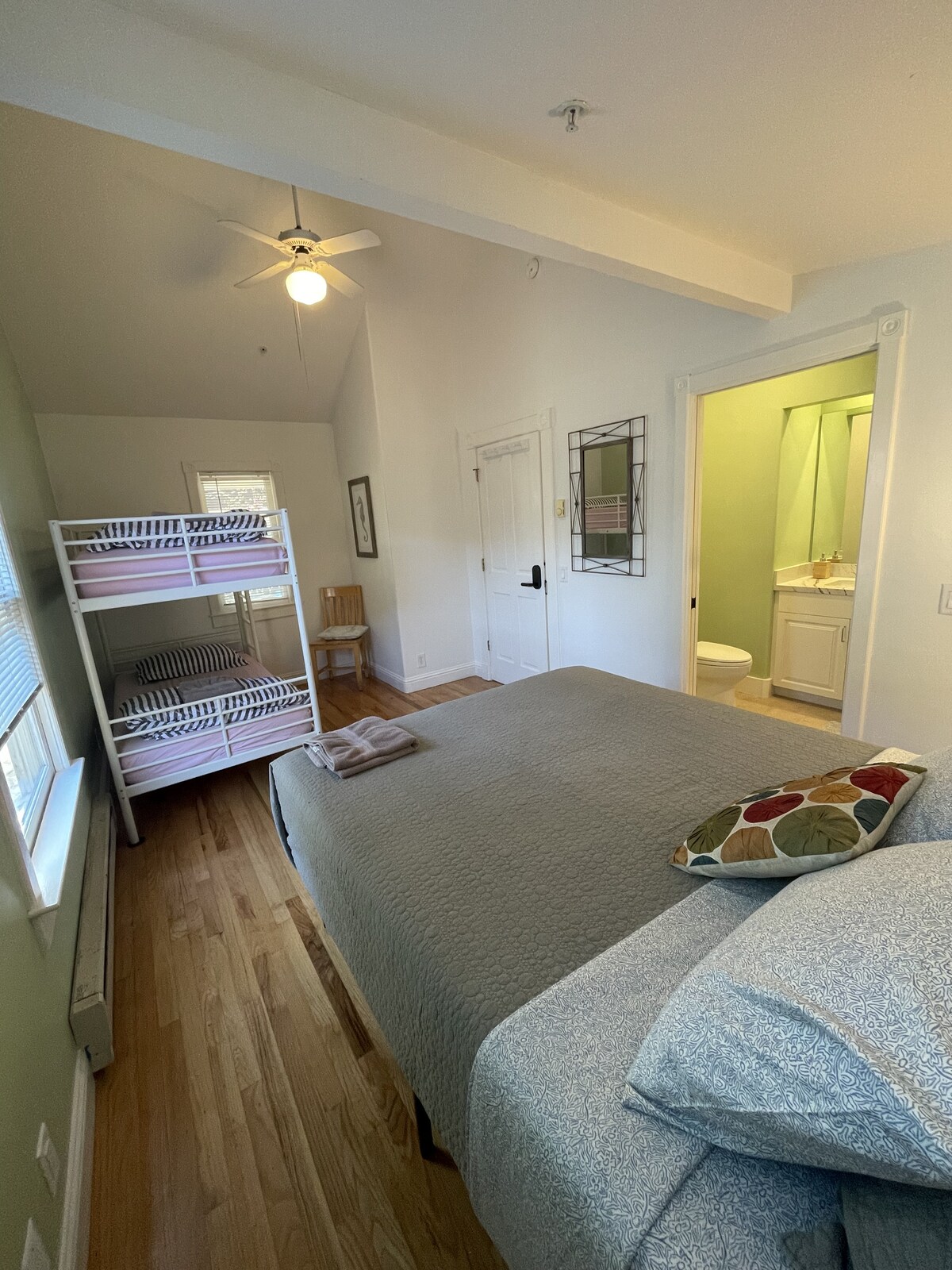 Stay in a private room with ensuite bathroom inside the Santa Cruz Hostel—a friendly, community-minded nonprofit hostel just 2 blocks from the Wharf, beach, and Boardwalk. Enjoy the comfort of a private space with access to shared kitchens, gardens, and common areas. This is a beautiful room with a queen bed, twin bed and private bathroom. Your reservation has exclusive access to this room (it is not shared with other guests). *beach towels are not provided