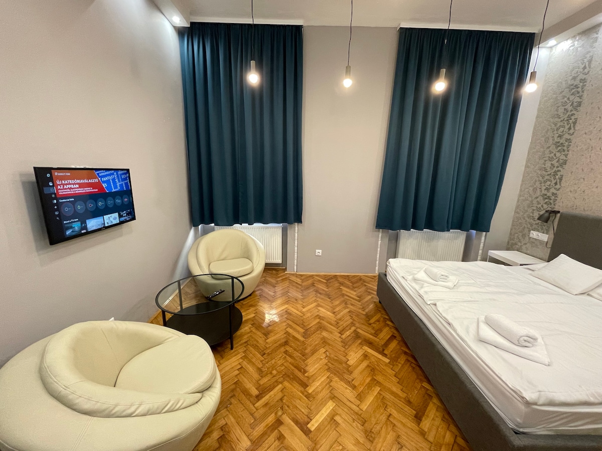 Habitació nova, amb un disseny molt bonic, al cor de la ciutat, amb aire condicionat, nevera, sala d'equipatge, serveis per a nadons. Tot està a poca distància a peu: restaurants/bars, atraccions, llocs d'interès famosos, botigues de comestibles, (Basílica, Budapest Eye, Danubi, Fashion street). Pots gaudir de les millors vacances de Budapest de la història. El servei de neteja diària està inclòs!