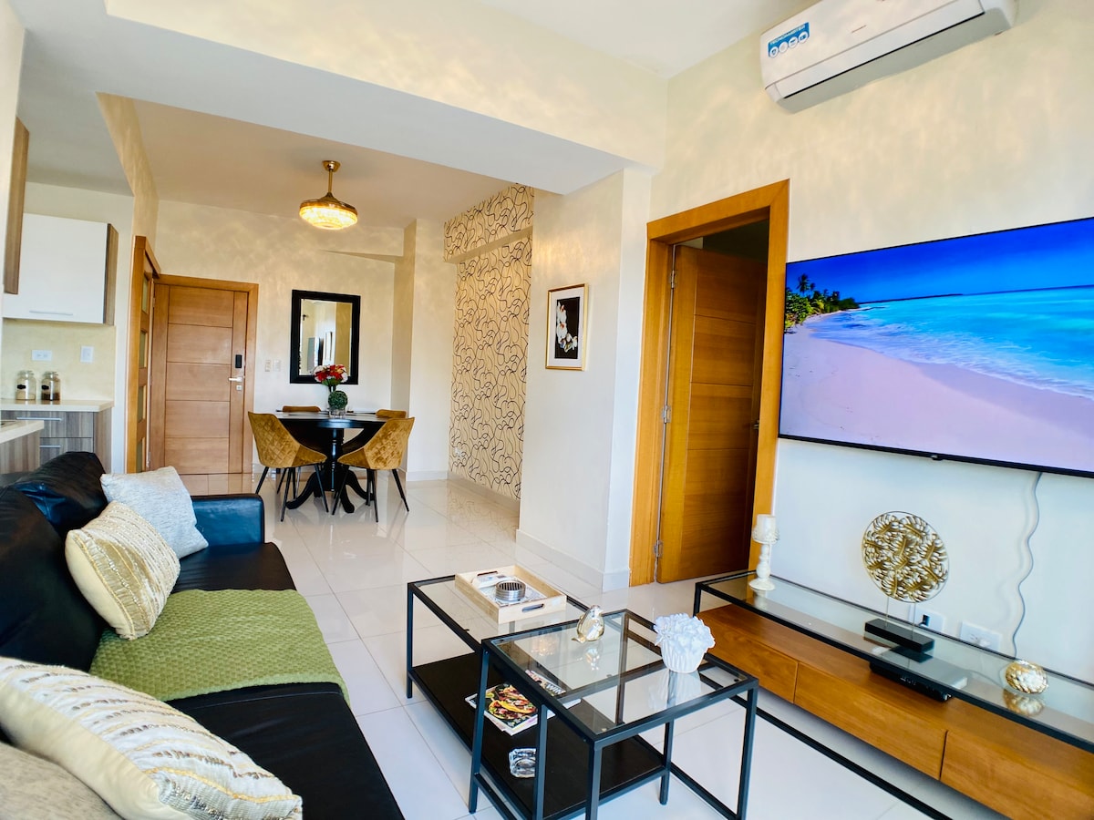 Stylish 1BR in the exclusive neighborhood of Piantini, Santo Domingo. Enjoy the 72m² of comfort with a private balcony, rooftop social area with BBQ, lounge space, and fast WiFi. Located in one of the most secure neighborhoods within a secure building, steps from Blue Mall, Ágora Mall, and Acrópolis Center. Surrounded by top restaurants, cafés, and banks—everything you need is within walking distance. Perfect for international travelers. Book now and enjoy special May rates—limited time only!