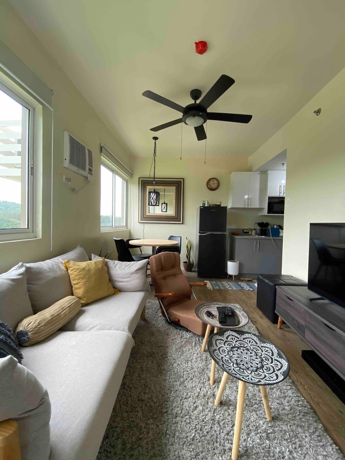 KDM's Crib a Studio Unit at Stanford Suites 3, South Forbes City. Totalment moblat amb llit queen size (roba de llit de cotó de qualitat hotelera), wifi, televisor intel·ligent (Netflix, Youtube, etc.), nevera inverter, aire condicionat, escalfador de dutxa, bidet de vàter, microones, campana extractora, cuina d'inducció, estris, estris, cuina d'arròs amb vaporitzador, bullidor elèctric, calaixos i armaris integrats (armari, rebosteria, safareig), mini taula de menjador amb tamborets apilables i mini sofà.