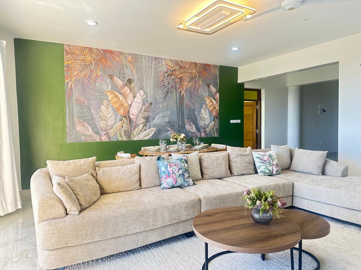 Relaxa't i gaudeix del teu propi pis privat nou i elegant darrere del centre Nyali i del centre comercial de la ciutat, a poca distància a peu de la platja, amb seguretat, privacitat, piscina i gimnàs. A prop hi ha els complexos turístics Bliss, Sunrise i Emirates. El pis és ideal per a una parella i disposa de totes les instal·lacions i equipaments. Té una cuina totalment equipada i una sala d’estar amb sostre de guix decoratiu, televisor i wifi. Us hi donem la benvinguda!
