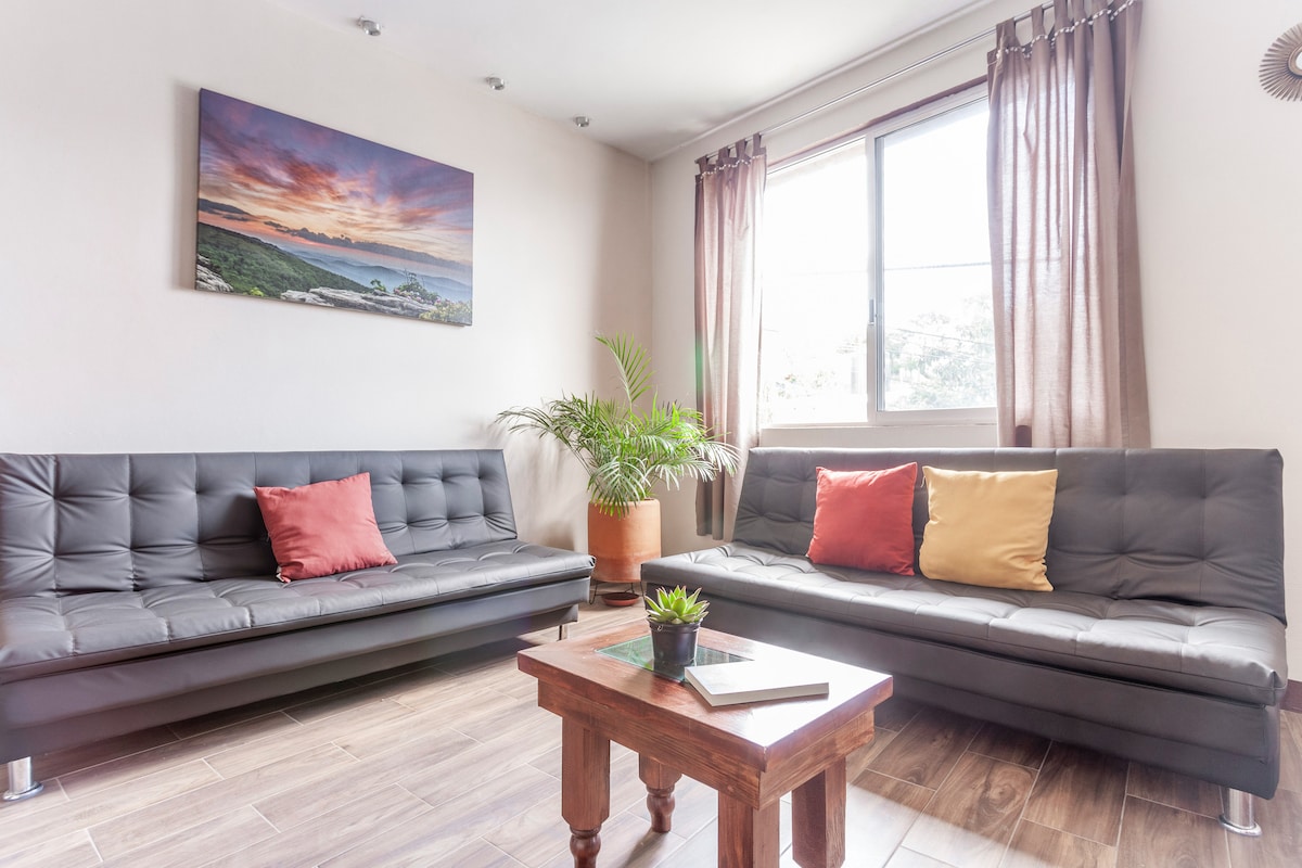 If you´re searching for a place to stay near Oaxaca City downtown . We have the best option for you. We offer you the most confortable apartment free from Covid 19. Enjoy the wonderful view, a complete kitchen, bathroom, bedroom for two and also a service yard. In addition, we have Wi-Fi service, smart T.V. and two single sofa-bed. The laundry service is only two blocks away as well other stores.