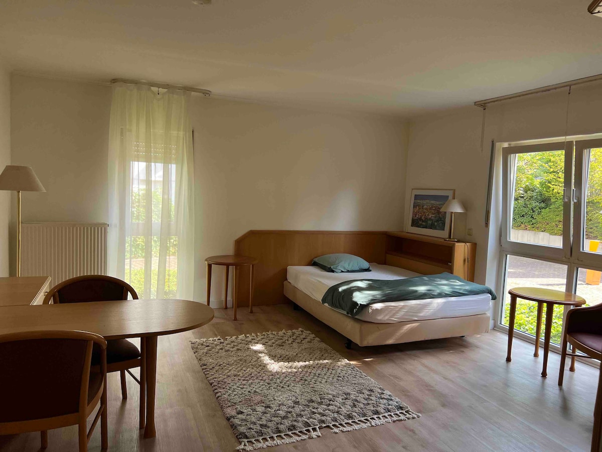El teu allotjament és una part separada de casa nostra i està situat en un barri preciós per a antics oficials nord-americans. Teniu a la vostra disposició una sala d'estar de 35m2 amb una gran terrassa(còmoda!) Sofà llit, una nevera, un dormitori amb un llit doble (només una cama queen size!!!), així com un bany amb dutxa i una banyera. A la zona d'entrada hi ha cuina americana, vajilla, coberts i vasos, però NO CUINA! Tens una terrassa darrere de la casa i una plaça d'aparcament just davant de la porta.
