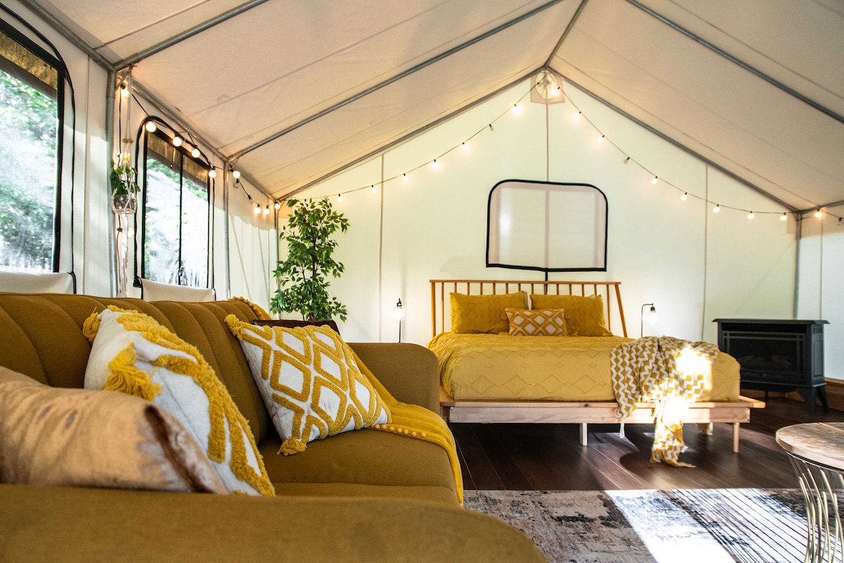 Aquest lloc inoblidable és tot menys ordinari. Si somies amb una experiència de tenda de luxe, la has trobat! Un matalàs d'escuma queen amb llençols de cotó, mininevera, cafè i microones, una petita graella de carbó, plats, hamaca i anell de foc i seients a l'aire lliure. Els banys del càmping estan a uns 80 metres de distància amb dutxes calentes i aparcament una mica més endavant. L'ombra del sol i el aire condicionat ajuden amb la calefacció, però encara poden estar càlids durant els dies de calor. La nit pot ser fresca fins i tot amb l'ús de la calefacció.