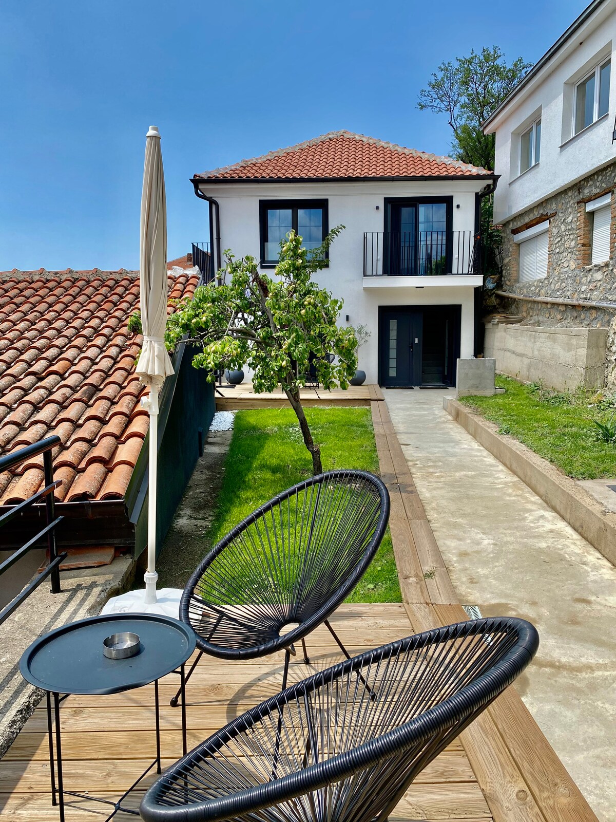 Enjoy a stylish stay in this centrally located studio apartment with lake view and a private patio garden in the heart of Ohrid’s Old Town. Set within a newly restored boutique villa (2022), this hidden gem is tucked away in a charming cobblestone alley, offering both privacy and authentic Old Town atmosphere. This space blends traditional character with modern comfort, making it ideal for couples or solo travelers. Just steps away from the lake, promenade, and all major attractions.