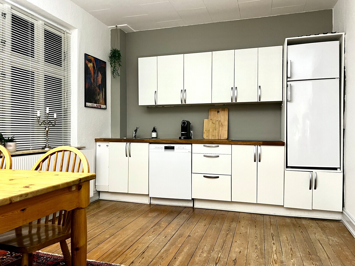 Et donem la benvinguda al nostre petit oasi, just al centre de Vejle! Situat a només 100 metres del carrer comercial i dels restaurants, aquesta és la base perfecta per explorar la ciutat. També trobaràs connexions d'autobús a l'aeroport de Billund a només 50 metres. El pis té dues habitacions: una amb un còmode llit doble (180 cm) i una amb un sofà llit que proporciona espai per a un 3. Hoste La cuina totalment equipada és ideal per cuinar lleugerament i el bany principal ofereix comoditat durant l'estada. Et donem la benvinguda!
