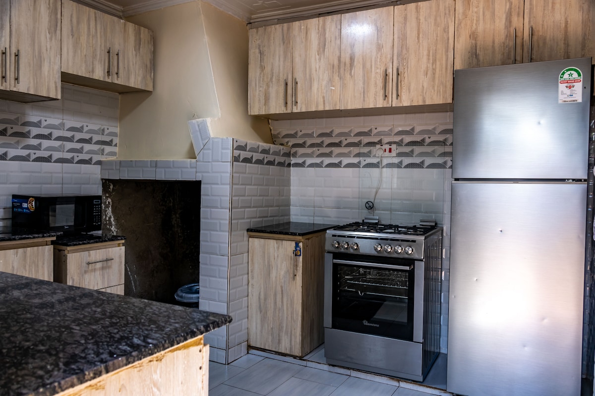 Escapa't a aquesta acollidora casa de 3 dormitoris envoltada de natura i terres de conreu, a només 15 km de la ciutat de Nakuru. Gaudeix d'una sala d'estar espaiosa amb televisor intel·ligent, una cuina totalment equipada, un menjador i un espai de treball. Relaxa't al jardí de darrere, amb còmodes seients moblats i una taula de menjador, i gaudeix del jardí davanter. Perfecte per a parelles, famílies o amics. Explora atraccions properes com el cràter Menengai, el llac Nakuru, el llac Elementaita, Hell's Gate, el llac Naivasha i les cascades de Thomson.