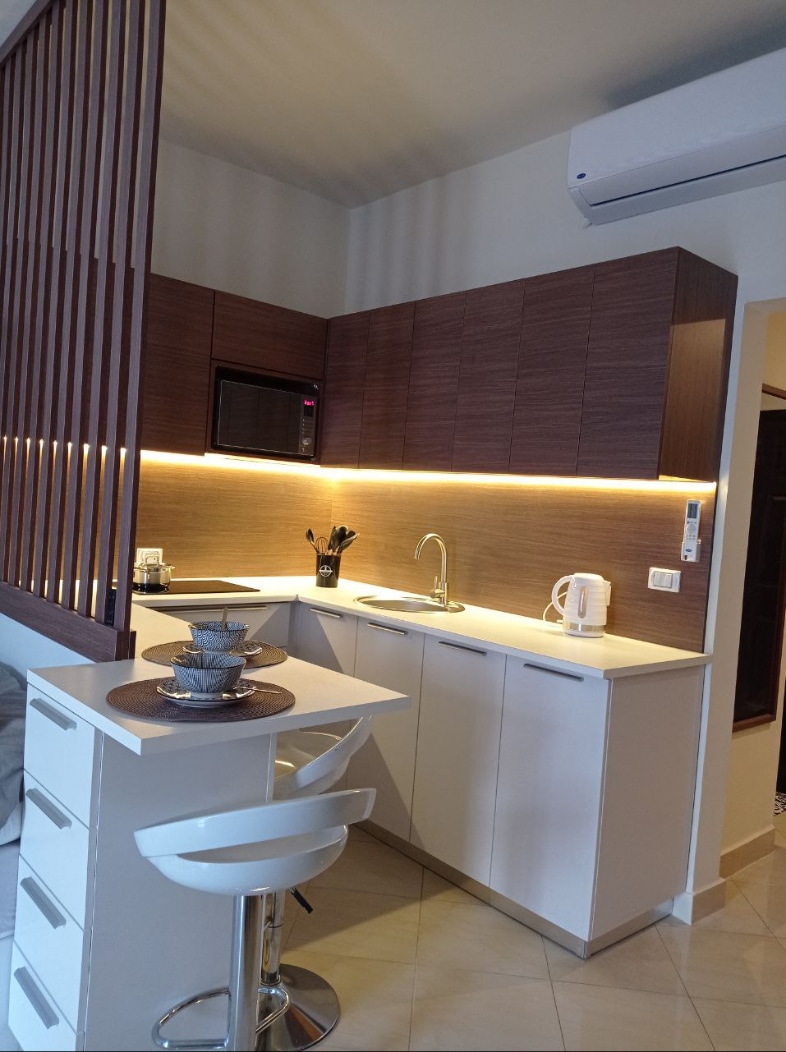 Gaudeix d'una estada única al nostre elegant apartament al 4t pis amb una vista fantàstica del jardí i la piscina. L'apartament consta d'una sala d'estar amb un sofà, un llit gran, una cuina oberta, un bany elegant i una terrassa espaiosa que et permet relaxar-te en un ambient tranquil. El que distingeix la nostra residència és la seva ubicació única dins d'un complex residencial tranquil, on tens fàcil accés a un centre comercial (mall) a només 20 passos de l'apartament, amb una gran varietat de restaurants i cafeteries. A més, el lloc és a només 10 minuts de l'aeroport, per la qual cosa és ideal per a viatgers que busquen comoditat.