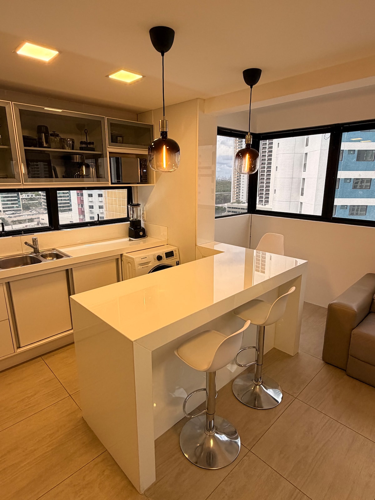 Pis es troba en una excel·lent ubicació, en un dels barris més nobles de Recife, Pina, a metres del centre comercial Rio Mar, caixa forta,dormitori i sala d'estar, amb llit doble i sofà llit a la sala d'estar, estufa amb forn, microones, aire condicionat 2 (Split), 2 televisors, 100Megas wifi, armari, mirall, menjador i taula de treball, utensilis de cuina i electrònica, olles, etc., assecador de cabell, peces de llit i bany. Moblat, espai de garatge, gimnàs, restaurant, piscina i terrat. Bonica vista de Recife.
