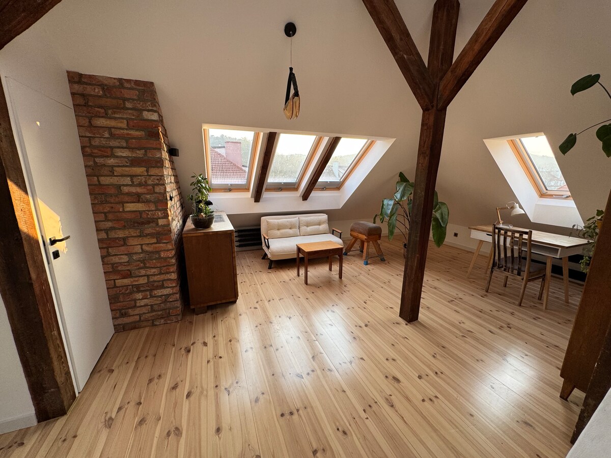 Un pis únic amb llar de foc a l'àtic. Vam crear aquest lloc només per a nosaltres mateixos, originalment amb pintures, llibres, una col·lecció de cactus i ceràmica feta a mà. Ens vam encarregar de la comoditat: 2 butaques i un sofà, una llar de foc i molts coixins. També hi ha una cuina equipada, una taula amb 4 cadires, un escriptori de treball i internet de fibra òptica ràpida. A prop hi ha una pizzeria, un bar, botigues, a 5 minuts a peu de l'estació de Gdańsk Oliwa.