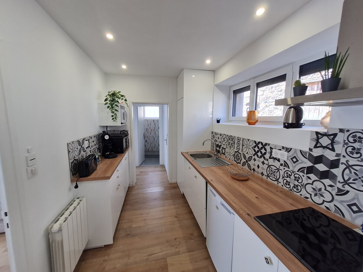 Acollidor niu privat en un entresol d'un antic hotel renovat al cor del poble, en la desertificació de Rochefort Montagne, ideal per fer senderisme, esquiar i descobrir Auvergne, Sancy i la cadena de muntanyes Puy. Banyera d'hidromassatge, aire condicionat, llit Emperor (2x2m), matalàs EMMA sobre llates, cuina totalment equipada amb rentavaixelles, forn, microones, bateria d'estris, fondue, crep, raclette, fogons de gas i inducció, nevera SMEG, rentadora, assecadora, televisor LG