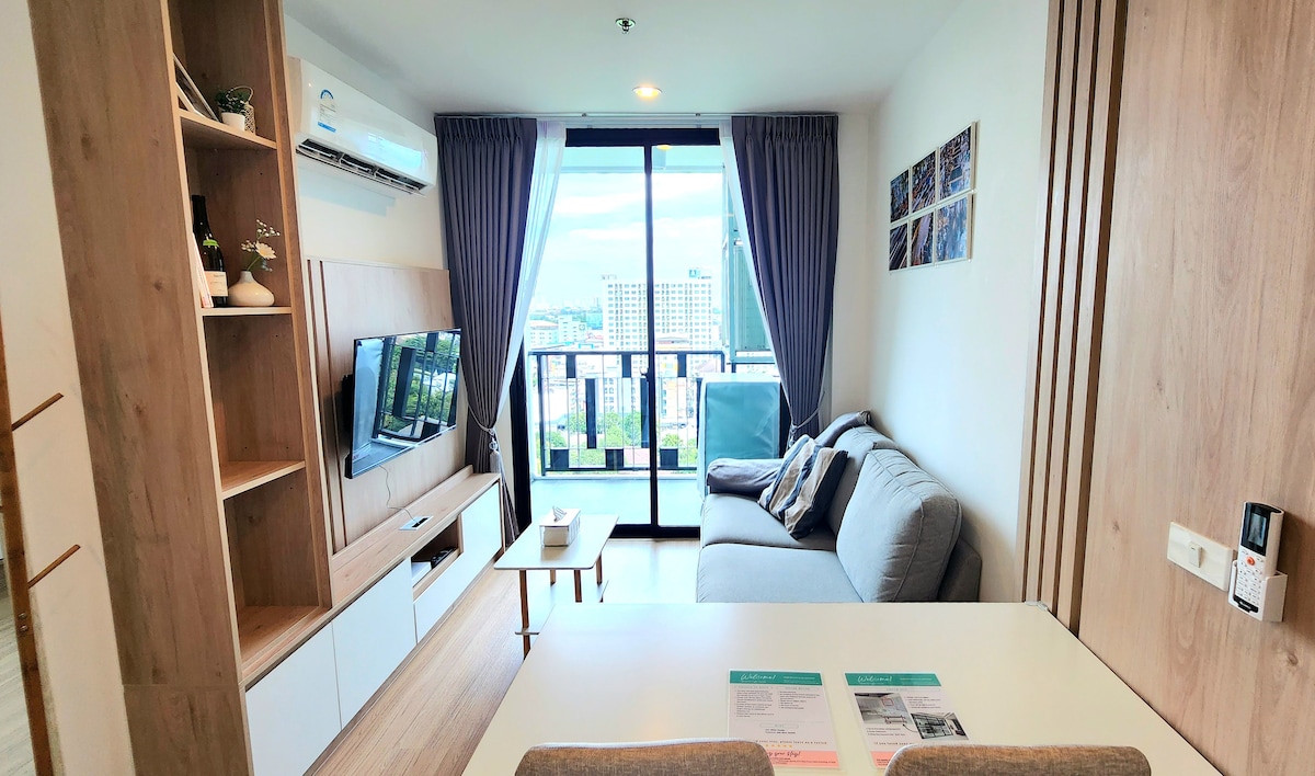 Allotjament contemporani a prop de l'estació BTS Onnut (E9) a només 5 minuts a peu o a 300 metres. És molt fàcil moure 's i a només 15 minuts del centre de la ciutat. Pis de 1 habitació totalment moblat amb llit de mida queen, sofà còmode a la sala d'estar moderna, taula de menjador, armari gran, tocador. Fogons de ceràmica amb campana extractora, rentadora i caixa forta digital (caixa forta). Bany amb mampara de dutxa de vidre temperat. Pany digital a la porta. Wifi gratuït i Netflix!! Molt còmode i acollidor per a estades llargues o curtes.